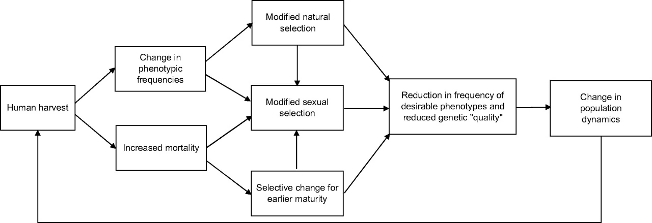 Fig. 1. Human harvest can have a variety of direct and indirect genetic effects on populations, and it has the potential to affect the future yield and viability of exploited populations.